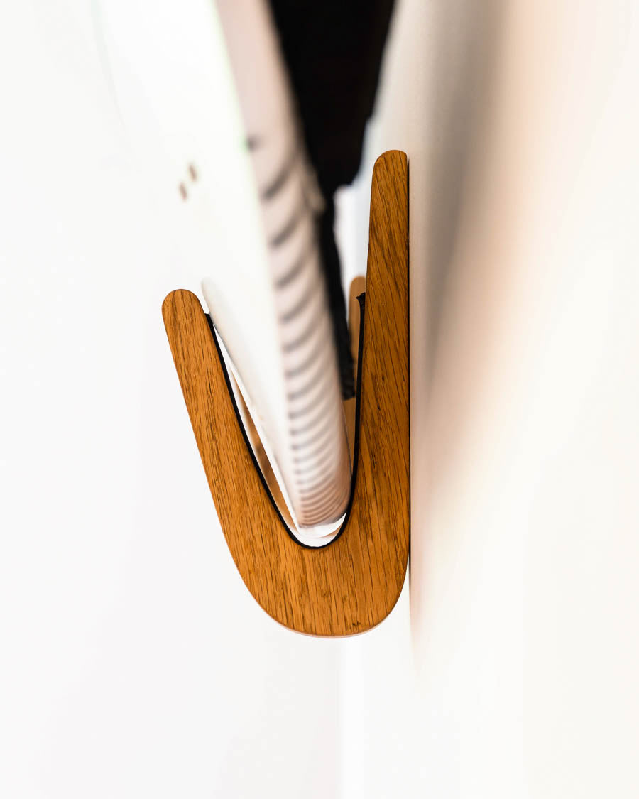 Designed in a drop shape, this surfboard wall mount adapts to any rail thickness. Simply adjust the spacing depending on your board’s size. Perfect for shortboards, a 9’4 noserider, or even an 8’6 gun – this mount is universally compatible.